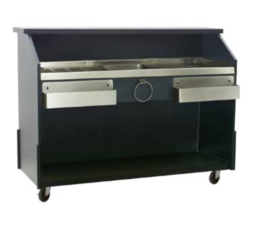 Standard Portable Bar, indoor use, 63"W x 24-3/8"D x 48"H, stainless steel interior work surface with 15-3/8" x 19-3/4" x 8" deep ice bin with 1-1/2" drain, replacement bin included, black Formica top, white melamine exterior, front bumper guards, (2) soda gun openings, (2) single speed rails, chrome-plated steel towel ring, 4" plate casters (2 with brake)