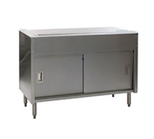 Spec-Master® Urn Stand, 79"W, 16 gauge stainless steel top, 4-3/4" trough sloped to 1" drain, full length removable louvered grate, 20/430 stainless steel enclosed base with sliding doors, 1-5/8" O.D. stainless steel tubular legs with adjustable plastic bullet feet, NSF