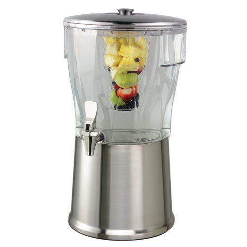 Beverage Dispenser, 5 gallon (640 oz.), 13-1/4" x 14-3/4" x 23", includes: removable infuser tube, stainless spigot, and (3) flavor indicator stickers: "Now Serving", "Iced Tea", "Water" & "Lemonade", clear BPA Free Tritan container (dishwasher safe), stainless steel lid & base (hand wash only), brushed finish, NSF (Priced per each, packed 6 each per case)