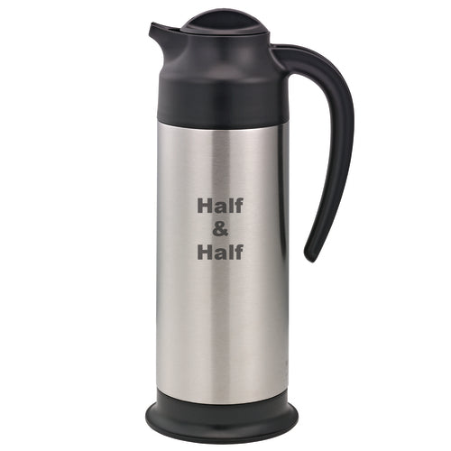 SteelVac™ Vacuum Creamer, 1 liter (33.8 oz.), 4-1/2" x 6" x 11-1/2", "Half & Half" etched on side, retention: 4-6 hours, dishwasher safe, smooth body, double-wall, unbreakable liner, screw-on lid, black plastic footed base, stainless steel, brushed, NSF (Priced per each, packed 6 each per case)