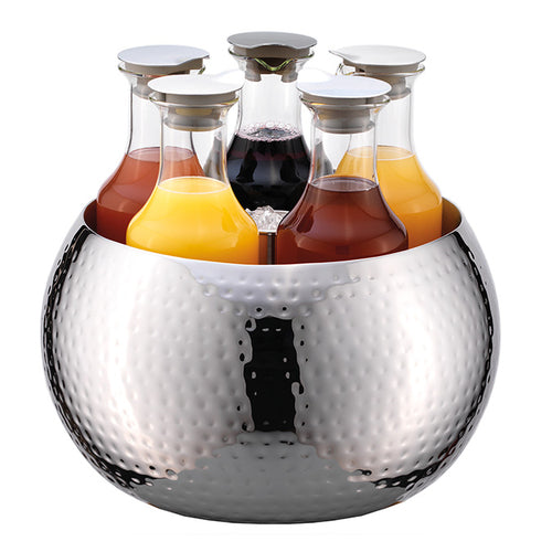Frilich® Carafine Beverage Tub Set, 13-4/5" dia. x 12-3/5"H, includes: (5) 1.3 qt. (1.2 liter) Tritan plastic carafes with stainless steel lids, double wall stainless steel tub, removable stainless steel crushed ice tube, hammered finish
