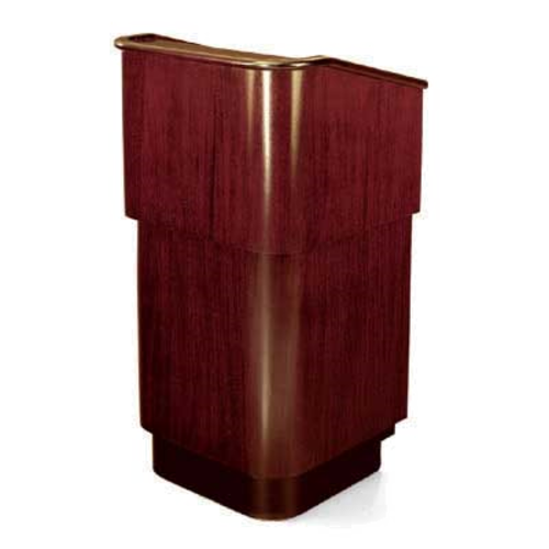 Podium, 27-1/2"W x 24-1/2"D x 47"H, floor-style, faceted design, (2) shelves, (2) wheels for tilt & roll maneuverability, solid wood trim, wood veneer finish