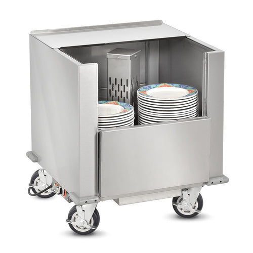 Heated Dish Storage Cart, (120-200) 11" plate capacity, adjustable thermostat, 100°F to 202°F temperature range, enclosed, insulated, sliding top, (2) flush mounted flip down doors, stainless steel construction, (4) 5" swivel casters with brakes, cULus, UL EPH Classified