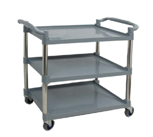 Bus Cart, 3-tier, 41"W x 19-1/2"D x 45-1/2"H, shelf size approximately 31" x 19-1/2", grey plastic construction with aluminum uprights, (3) sides with 1" upturn & (1) side with 1/8" upturn, 200 lb. load capacity, (1) handle on each short side, 5" swivel casters, ETL (ships KD)