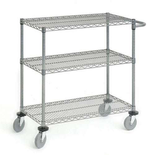 Wire Cart, 3-shelf, 36" x 18" x 39-1/2"H, 400 lb. capacity (per shelf), with handle, adjustable shelves, (4) 5" dia. swivel casters (2 locking), epoxy-coated, zinc-plated steel wire, flint finish, NSF (10 year limited guarantee against corrosion and manufacturer defect)