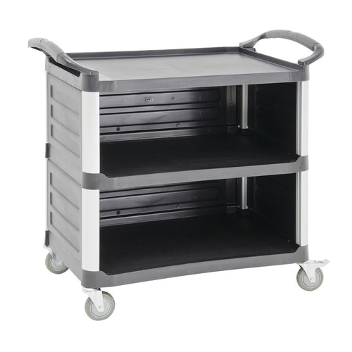 Service Cart, 3-shelf, 38-1/2" x 20-7/8" x 36-5/8"H, light duty, 200 lb. capacity, (3) enclosed sides, non-slip shelves, 12" spacing between shelves, (4) swivel casters (2 locking), aluminum posts, polypropylene, black