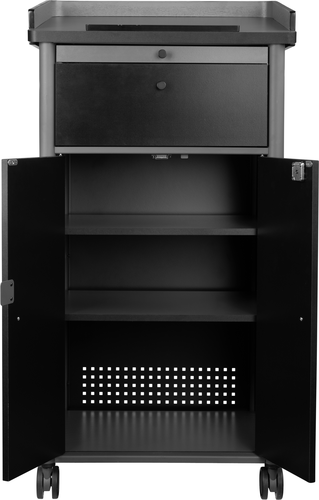 Oklahoma Sound® Greystone Lectern, 23-1/2"W x 19-1/4"D x 45-1/2"H, slide-out trays (left & right), slide-out keyboard shelf, steel cabinet with (2) adjustable shelves, drawer & (2) locking doors, grey plywood