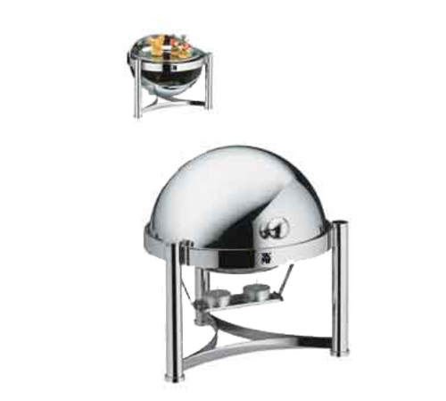 Portions Chafing Dish, 10-1/4" dia. x 11-1/2"H, small, full roll top, knob handle, round feet, fits for 9" dia. porcelain plates, heated by 2 tea lights, 18/10 stainless steel, Standard by WMF (insert & tea lights not included)