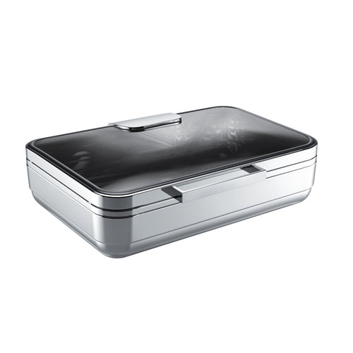 Induction Chafing Dish, GN 1/1, 22-13/16" x 18-1/2" x 7-1/2", 4-corner handle, glass lid, removable brake, fits inserts to 4" deep, electric & sterno heat, 18/10 stainless steel, satin finish, Manhattan, Hot & Fresh by WMF