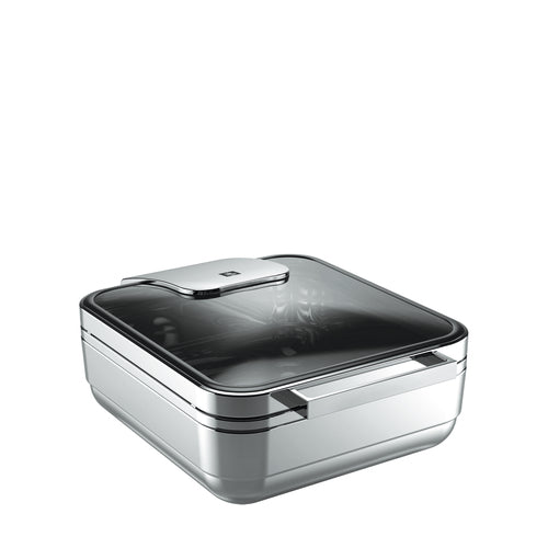 Induction Plus Chafing Dish, 2/3 GN, 17-3/4"L x 14-1/2"W x 7-1/2"H, square, removable glass lid with brake, heat-resistant satin finished 4-corner handle, electric/canned heat possible, 18/10 stainless steel, Arte by Hepp