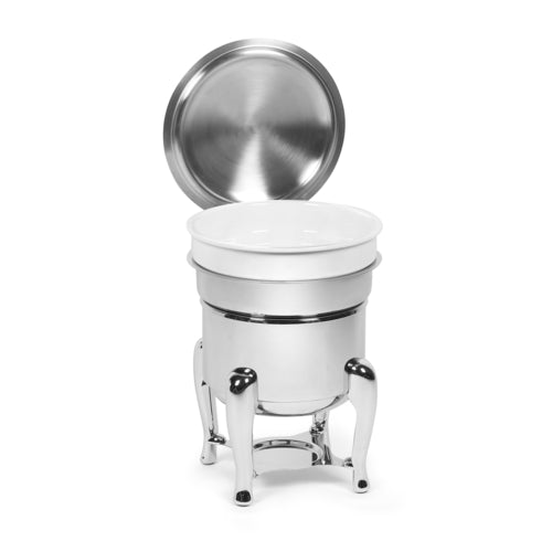 Classic Marmite Soup Chafer, 4.5 qt., hinged lid with knob, opens fully, includes sterno shelf and holder, removable white porcelain food pan, classic legs, heavy duty stainless steel construction, 5 Star Series
