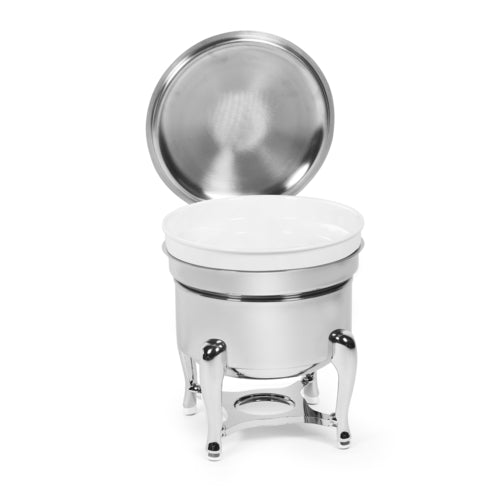 Classic Marmite Soup Chafer, 7 qt., hinged lid with knob, opens fully, includes sterno shelf and holder, removable white porcelain food pan, classic legs, heavy duty stainless steel construction, 5 Star Series
