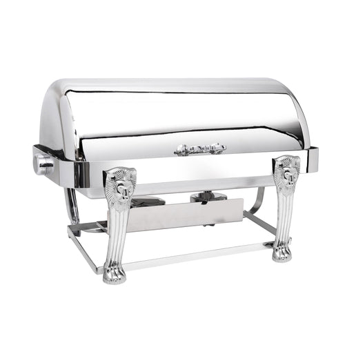 Lion Head Chafer, 8 qt., rectangular, roll top cover, stops at any angle, 180° full roll back, includes dual sterno holders, food pan and water pan, with legs, 18/10 stainless steel, brushed finished lid, 5 Star Series (made to order, non-returnable)