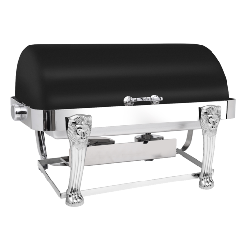Lion Head Chafer, 8 qt., rectangular, roll top cover, stops at any angle, 180° full roll back, includes dual sterno holders, food pan and water pan, with legs, 18/10 stainless steel, XYLO black finish with Anti-Microbial 24/7 germ-free surface coated lid, 5 Star Series (made to order, non-returnable)
