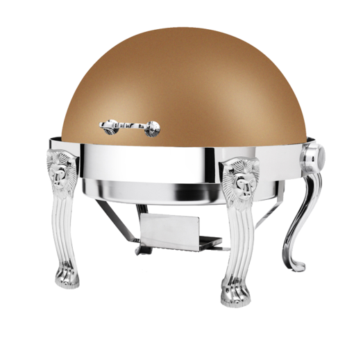 Lion Head Collection Chafer, 8 qt., round, roll top cover, stops at any angle, 180° full roll back, includes dual sterno holders, food pan and water pan, with legs, 18/10 stainless steel, XYLO bronze finish with Anti-Microbial 24/7 germ-free surface coated lid, 5 Star Series (made to order, non-returnable)