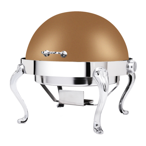 Queen-Anne Collection Chafer, 8 qt., round, roll top cover, stops at any angle, 180° full roll back, includes dual sterno holders, food pan and water pan, with legs, 18/10 stainless steel, XTLO bronze coated finished lid, 5 Star Series