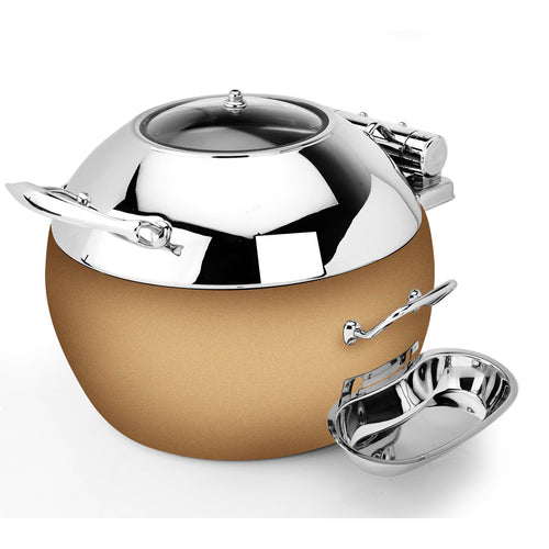 Crown Collection Soup Chafer, 11 qt., round, includes: hinged glass lid, drip free feature, removable food pan, vessel itself is a water pan, hydraulic hinged slowed letdown mechanism, locks in at 180°, removable clip on utensil holder, 18/10 stainless steel, XYLO bronze finish with Anti-Microbial 24/7 germ-free surface coated base only, 5 Star series (made to order, non-returnable)
