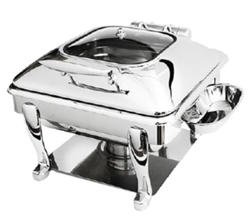 Crown Collection Induction Chafer, 6 qt., square, includes: hinged glass lid with drip free feature, Freedom style stand, food pan, hydraulic hinged slowed letdown mechanism, locks in at 180°, vessel works as a water pan, sterno holder, removable clip on utensil holder, brake lock system, works on all induction warmers/cookers/or as chafer tabletop, 18/10 stainless steel, brushed finish, 5 Star Series (made to order, non-returnable)