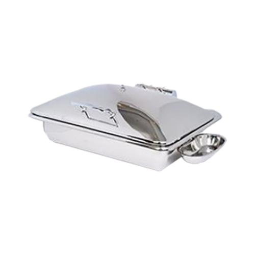 Crown Collection Induction Chafer, 8 qt., rectangular, without stand, includes: hinged solid lid with drip free feature, food pan, vessel works as a water pan, hydraulic hinged slowed letdown mechanism, locks in at 180°, removable clip on utensil holder, brake lock system, works on all induction warmers/cookers/or as chafer tabletop, 18/10 stainless steel, brushed finish, 5 Star Series (made to order, non-returnable)