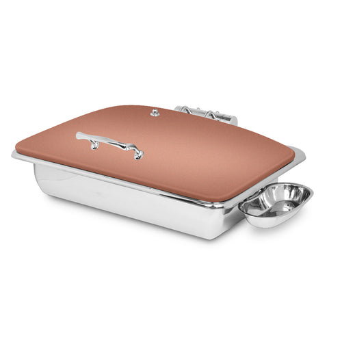 Crown Collection Induction Chafer, 8 qt., rectangular, without stand, includes: hinged solid lid with drip free feature, food pan, vessel works as a water pan, hydraulic hinged slowed letdown mechanism, locks in at 180°, removable clip on utensil holder, brake lock system, works on all induction warmers/cookers/or as chafer tabletop, 18/10 stainless steel, XYLO copper finish with Anti-Microbial 24/7 germ-free surface coated lid, 5 Star Series (made to order, non-returnable)