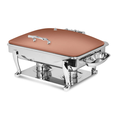 Crown Collection Induction Chafer, 8 qt., rectangular, includes: hinged lid with drip free feature, Freedom style stand, hydraulic hinged letdown mechanism, locks in at 180, food pan, vessel works as a water pan, sterno holder, removable clip on utensil holder, brake lock system, works on all induction warmers/cookers/or as chafer tabletop, 18/10 stainless steel, XYLO copper finish with Anti-Microbial 24/7 germ-free surface coated lid, 5 Star Series (made to order, non-returnable)