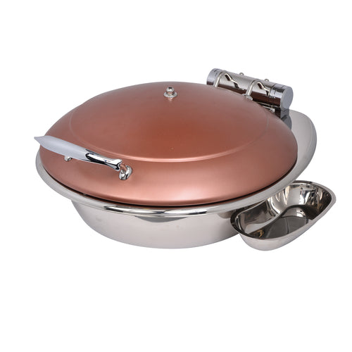 Crown Collection Induction Chafer, 6 qt., round, without stand, includes: hinged lid with drip free feature, food pan, vessel works as a water pan, hydraulic hinged slowed letdown mechanism, locks in at 180°, removable clip on utensil holder, brake lock system, works on all induction warmers/cookers/or as chafer tabletop, 18/10 stainless steel, XYLO copper finish with Anti-Microbial 24/7 germ-free surface coated lid, 5 Star Series (made to order, non-returnable)