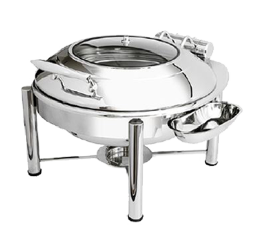 Crown Collection Induction Chafer, 6 qt., round, includes: hinged glass lid with drip free feature, Pillared style stand, food pan, vessel works as a water pan, hydraulic hinged slowed letdown mechanism, locks in at 180°, sterno holder, removable clip on utensil holder, brake lock system, works on all induction warmers/cookers/or as chafer tabletop, 18/10 stainless steel, brushed finish, 5 Star Series (made to order, non-returnable)
