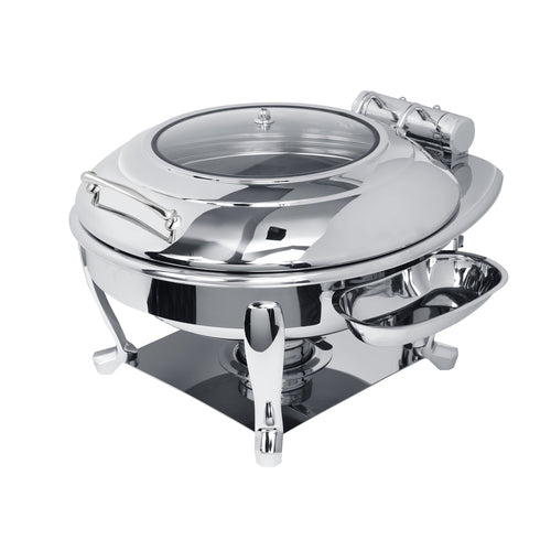 Crown Collection Induction Chafer, 6 qt., round, includes: hinged glass lid with drip free feature, Freedom style stand, food pan, vessel works as a water pan, hydraulic hinged slowed letdown mechanism, locks in at 180°, sterno holder, removable clip on utensil holder, brake lock system, works on all induction warmers/cookers/or as chafer tabletop, 18/10 stainless steel, brushed finish, 5 Star Series (made to order, non-returnable)