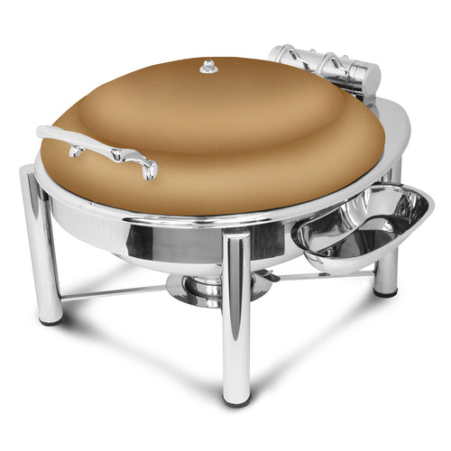 Crown Collection Induction Chafer, 6 qt., round, includes: hinged lid with drip free feature, Pillared style stand, food pan, vessel works as a water pan, hydraulic hinged slowed letdown mechanism, locks in at 180°, sterno holder, removable clip on utensil holder, brake lock system, works on all induction warmers/cookers/or as chafer tabletop, 18/10 stainless steel, XYLO bronze finish with Anti-Microbial 24/7 germ-free surface coated lid, 5 Star Series (made to order, non-returnable)