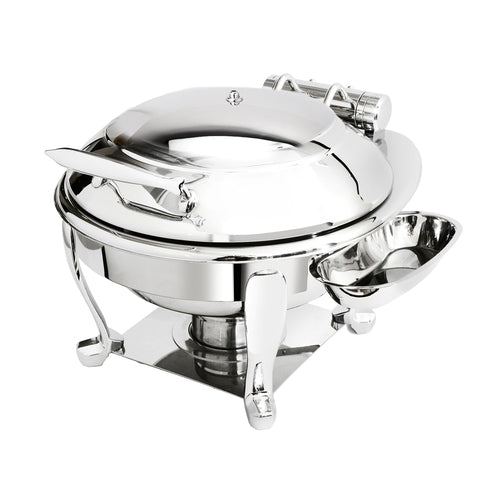Crown Collection Induction Chafer, 6 qt., round, includes: hinged lid with drip free feature, Freedom style stand, food pan, vessel works as a water pan, hydraulic hinged slowed letdown mechanism, locks in at 180°, sterno holder, removable clip on utensil holder, brake lock system, works on all induction warmers/cookers/or as chafer tabletop, 18/10 stainless steel, brushed finish, 5 Star Series (made to order, non-returnable)