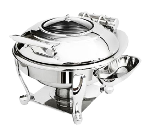 Crown Collection Induction Chafer, 4 qt., round, includes: hinged glass lid with drip free feature, Freedom style stand, food pan, vessel works as a water pan, hydraulic hinged slowed letdown mechanism, locks in at 180°, sterno holder, removable clip on utensil holder, brake lock system, works on all induction warmers/cookers/or as chafer tabletop, 18/10 stainless steel, 5 Star Series