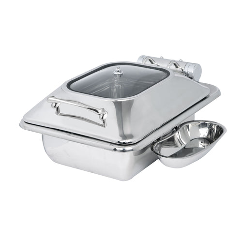 Crown Collection Induction Chafer, 4 qt., square, without stand, includes: hinged glass lid with drip free feature, food pan, vessel works as a water pan, hydraulic hinged slowed letdown mechanism, locks in at 180°, brake lock system, works on all induction warmers/cookers/or as chafer tabletop, 18/10 stainless steel, 5 Star Series