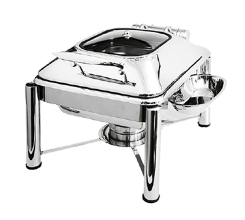Crown Collection Induction Chafer, 4 qt., square, includes: hinged glass lid with drip free feature, Pillared style stand, food pan, vessel works as a water pan, hydraulic hinged slowed letdown mechanism, locks in at 180°, sterno holder, removable clip on utensil holder, brake lock system, works on all induction warmers/cookers/or as chafer tabletop, 18/10 stainless steel, brushed finish, 5 Star Series (made to order, non-returnable)