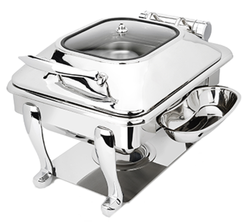 Crown Collection Induction Chafer, 4 qt., square, includes: hinged glass lid with drip free feature, Freedom style stand, food pan, vessel works as a water pan, hydraulic hinged slowed letdown mechanism, locks in at 180°, sterno holder, removable clip on utensil holder, brake lock system, works on all induction warmers/cookers/or as chafer tabletop, 18/10 stainless steel, brushed finish, 5 Star Series (made to order, non-returnable)
