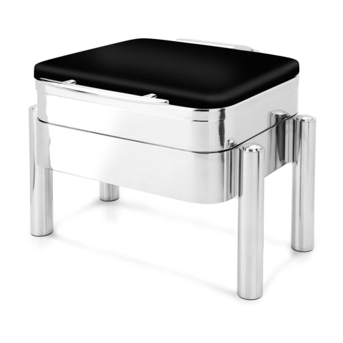 Jazz Swing Collection Chafer, 6 qt., square, with Pillar'd leg style stand, contemporary style hinged cover, sterno heat, drip free feature, includes food pan, (vessel itself is the water pan) can be used with electric heating element (sold separately), brake mechanism with stop & go feature, 18/10 stainless steel, XYLO black finish with Anti-Microbial 24/7 germ-free surface coated lid, 4 Star Series (made to order, non-returnable)