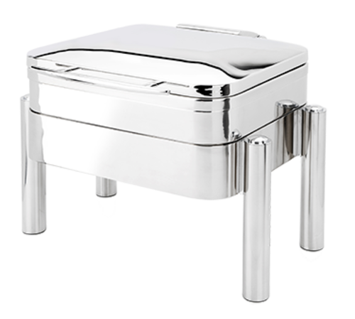Jazz Swing Collection Chafer, 4 qt., square, with Pillar'd leg style stand, contemporary style hinged cover, sterno heat, drip free feature, includes food pan, (vessel itself is the water pan) can be used with electric heating element (sold separately), brake mechanism with stop & go feature, 18/10 stainless steel, brushed finish, 4 Star Series (made to order, non-returnable)