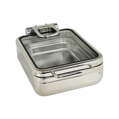 Jazz Rock Collection Induction Chafer, 4 qt., square, modern style, full glass hinged cover, drip free feature, includes food pan (vessel itself is a water pan), hydraulic hinged slowed letdown mechanism, locks in at 180°, works on all induction warmers/cookers/ or as a chafer tabletop, 18/10 stainless steel, 5 Star Series
