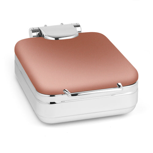 Jazz Rock Collection Induction Chafer, 6 qt., square, hotel grade, full hinged cover, 3-points of drip free feature with condensation catch, includes food pan, hydraulic hinged slowed letdown mechanism (locks in at 180°), works on all induction warmers/cookers/or as a chafer tabletop, 18/10 stainless steel, XYLO copper finish with Anti-Microbial 24/7 germ-free surface coated lid, 7 Star Series (made to order, non-returnable)
