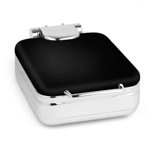 Jazz Rock Collection Induction Chafer, 6 qt., square, hotel grade, full hinged cover, 3-points of drip free feature with condensation catch, includes food pan, hydraulic hinged slowed letdown mechanism (locks in at 180°), works on all induction warmers/cookers/or as a chafer tabletop, 18/10 stainless steel, XYLO black finish with Anti-Microbial 24/7 germ-free surface coated lid, 7 Star Series (made to order, non-returnable)