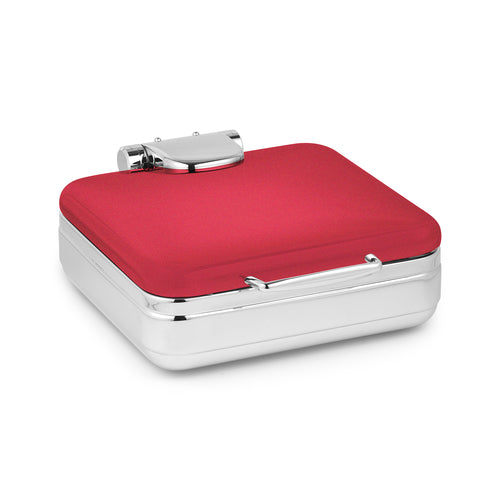 Jazz Rock Collection Induction Chafer, 6 qt., square, hotel grade, full hinged cover, 3-points of drip free feature with condensation catch, includes food pan, hydraulic hinged slowed letdown mechanism (locks in at 180°), works on all induction warmers/cookers/or as a chafer tabletop, 18/10 stainless steel, XYLO red finish with Anti-Microbial 24/7 germ-free surface coated lid, 7 Star Series (made to order, non-returnable)