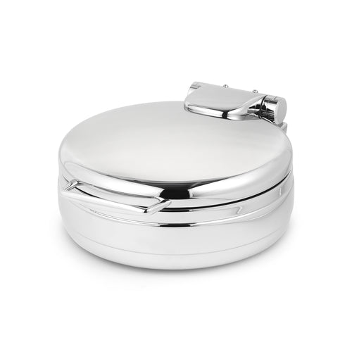 Jazz Rock Collection Induction Chafer, 4 qt., round, hotel grade, full hinged cover, 3-points of drip free feature with condensation catch, includes food pan, hydraulic hinged slowed letdown mechanism (locks in at 180°), works on all induction warmers/cookers/or as a chafer tabletop, 18/10 stainless steel, brushed finish, 7 Star Series (made to order, non-returnable)