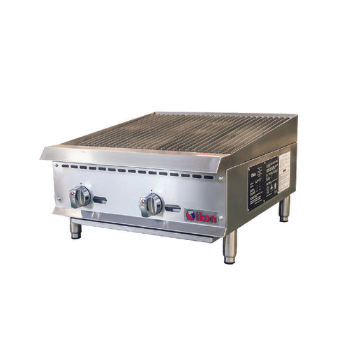 IKON Radiant Broiler, gas, 24" W x 34.4" D, (2) 35,000 BTU 'U' shape burners, 10 gauge cast iron radiants, rear flue, adjustable manual controls, 3-position cast iron grates, front lit pilot light, double wall insulated sides, back & side splash guards, removable full width crumb tray, rear gas regulator, stainless steel cabinet, adjustable stainless steel legs, non-skid feet, 70,000 BTU total, CSA-Sanitation, CSA Star, CSA Flame