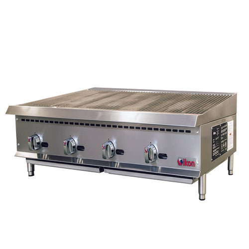 IKON Radiant Broiler, gas, 48" W x 34.4" D, (4) 35,000 BTU 'U' shape burners, 10 gauge cast iron radiants, rear flue, adjustable manual controls, 3-position cast iron grates, front lit pilot light, double wall insulated sides, back & side splash guards, removable full width crumb tray, rear gas regulator, stainless steel cabinet, adjustable stainless steel legs, non-skid feet, 140,000 BTU total, CSA-Sanitation, CSA Star, CSA Flame