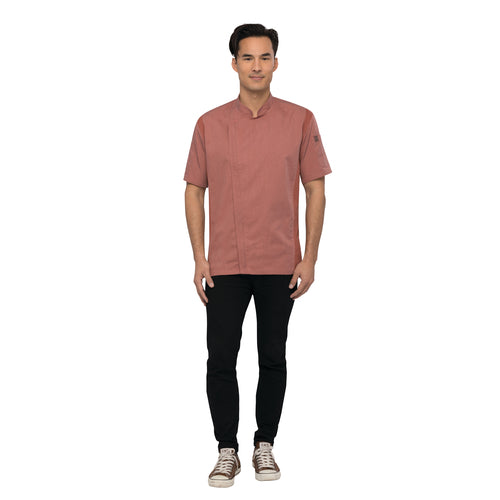 Springfield Chef Coat, single-breasted, short sleeves, 2-way separating zipper, Cool Vent™ sides, side seam slits, back collar apron holder with engraved snap, left sleeve rounded thermometer pocket, right sleeve rounded cell phone/notebook pocket, modern fit, 65/35 poly/cotton twill, brick, 2XL