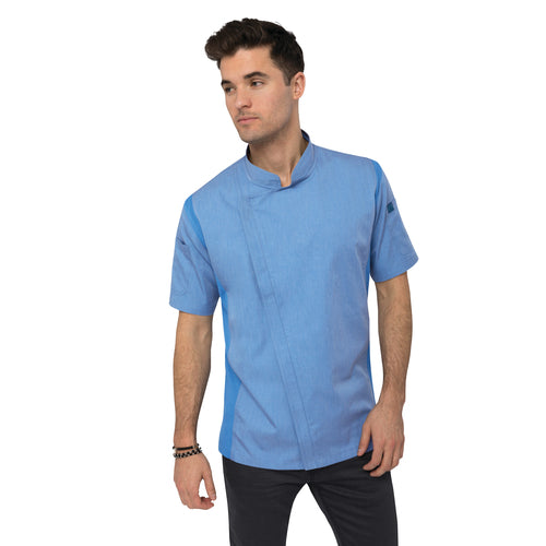 Springfield Chef Coat, single-breasted, short sleeves, 2-way separating zipper, Cool Vent™ sides, side seam slits, back collar apron holder with engraved snap, left sleeve rounded thermometer pocket, right sleeve rounded cell phone/notebook pocket, modern fit, 65/35 poly/cotton twill, sky blue, 2XL