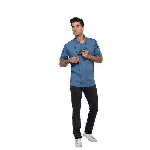 Springfield Chef Coat, single-breasted, short sleeves, 2-way separating zipper, Cool Vent™ sides, side seam slits, back collar apron holder with engraved snap, left sleeve rounded thermometer pocket, right sleeve rounded cell phone/notebook pocket, modern fit, 65/35 poly/cotton twill, sky blue, M