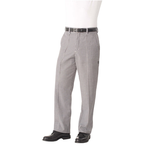 Essential Chef Pants, front seams, belt loops, sits on natural waist, relaxed hip and thigh, tapered leg opening, button closure, zipper fly, (2) side seam pockets, (2) back pockets, classic fit, 65/35 poly/cotton, small black/white check, size 44