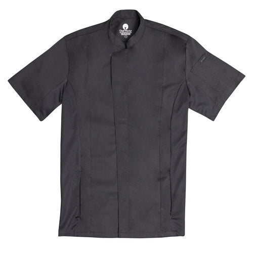 Bristol V-Series Chef Coat, single-breasted, short sleeves, concealed snap closure, Cool Vent™ sides & back panel, side seam slits, back collar apron holder with engraved snap, left sleeve thermometer pocket, hidden front zipper pockets, modern fit, 65/35 poly/cotton twill, black, XL