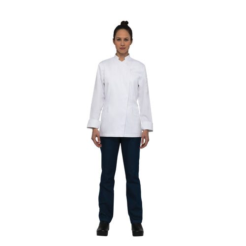 Women's Marrakesh V-Series Chef Coat, single-breasted, long sleeves, turn-back cuffs, cross over collar, concealed snap closure, stretch panels up the sides and down the sleeves, back collar apron holder with engraved snap, left sleeve thermometer pocket, hip pockets, slim fit, 65/35 poly/cotton, white, L