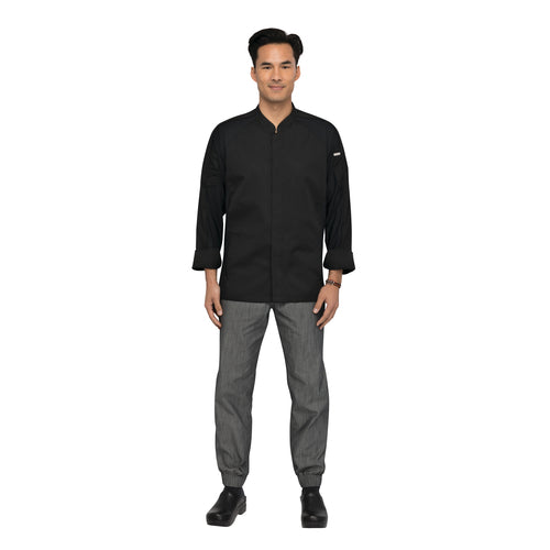 Valencia Prestige Knit Chef Coat, single-breasted, long sleeves with piping detail on seams, turn-back cuffs, concealed snap closure, contrast fabric with stretch knit and Cool Vent™ panels, side seam slits, back collar apron holder with engraved snap, left and right sleeve pockets, modern fit, 65/35 poly/cotton twill, black, XL